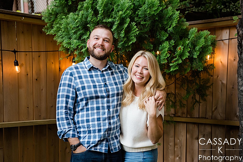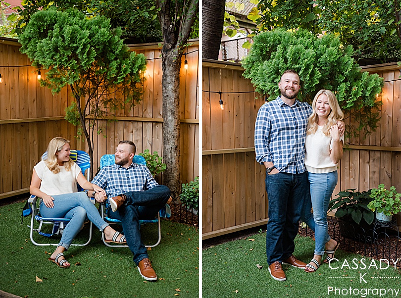 Meet Deirdre + Mike! We started their Jersey City engagement session at their apartment on a perfect summer evening. During Covid they made their small back yard space into a little oasis. They loved getting out their beach chairs and hanging outside, video chatting with friends and family, playing games, but still feeling safe. And more importantly, this was where Mike lit candles all throughout the apartment and was waiting outside for Deirdre (also lit with candles and lined with flowers) to propose.