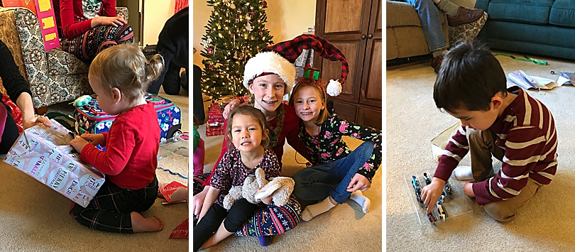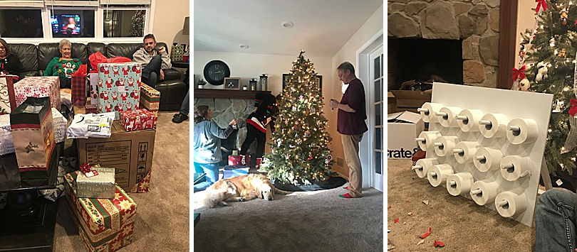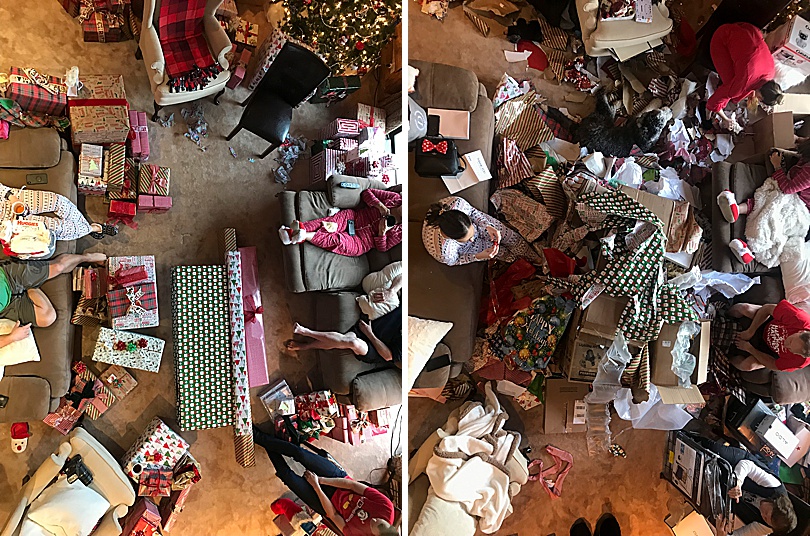 Christmas Eve evening we drove to my parents so that we could do Christmas morning with my family. Here’s the before and after. We don’t pick up any of the paper, ribbon or boxes while we’re opening the gifts.