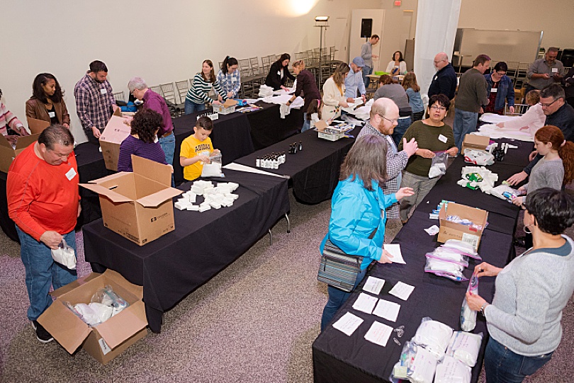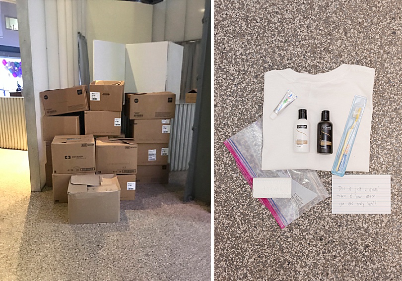 In March, instead of our church, Awaken, having a typical Sunday service we packed ziplock bags with a t-shirt, toothbrush, toothpaste, soap, shampoo, conditioner and a note of encouragement. All of which we had spent weeks collecting. We were able to pack 400 bags which were distributed to local homeless shelters.