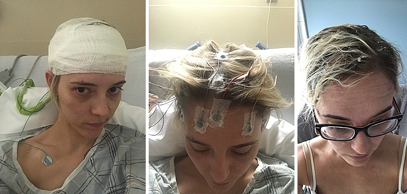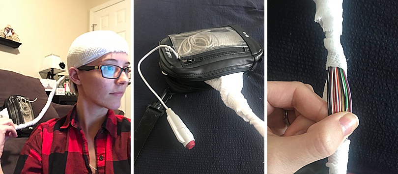 What to expect when you’re admitted into an Epilepsy Monitoring Unit (EMU): You’re admitted into the hospital and then taken up to the unit and your room. You’re given an IV, a technician attaches electrodes to your body for a continuous EKG and glues all the electrodes (I think I counted 25) to your head for the EEG. Finally your head is wrapped in an absurd amount of gauze. All of the wires from the electrodes are connected to a machine that you carry around in a little bag. Since the machine doesn’t have enough battery life to last 3-5 days, it’s attached to around a 30 foot power cord. So you’re basically on a leash and can’t leave your room. Not only are you monitored by the electrodes, but there’s also a camera monitoring the whole room (not the bathroom). The nurses in the unit monitor the EKG, EEG and the video the whole time you’re there. Once it’s all over they take the electrodes off with warm water. Your hair is a mess because of the glue chunks and the days of not washing your hair. It’s lovely.