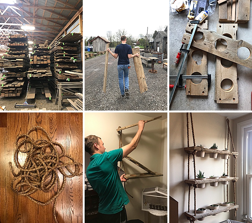 It a shame we don’t own a house because Ben loves to build things. And he’s such a perfectionist that what he builds is always perfect. He saw a picture of hanging shelves with holes in them to put pots in for plants. And with my love of plants, I was all in for another place to have plants in the apartment. We went to a reclaimed wood lumber yard near Ben’s parents at the beginning of the year so I could pick out the wood. Then he spent a good amount of the year building these awesome hanging shelves. (It took time since he had to borrow tools or wait until we went to one of our parents’ houses to use tools.) But I love my shelves with all my baby plants!