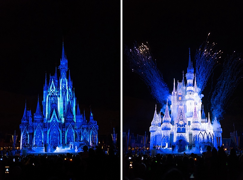 Ana and Elsa light up Cinderella’s Castle with icicles during the Frozen Holiday Wish.