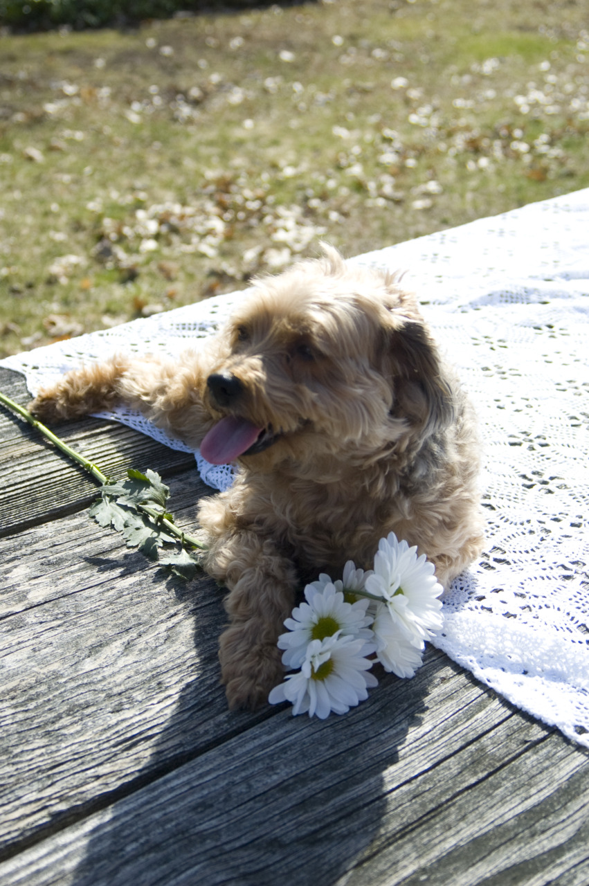 “Come here Sophie, come on baby,” she didn’t budge and she sat as far away from me with her back turned. She knows she has me wrapped around her finger…or paw…and with Sophie it is her way or you have to force her into your way. So I stomped across the yard and put her on the picnic table. Then it was a struggle between how quickly i could force her to lay down and snap a picture.