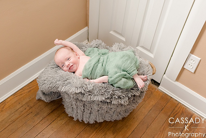 I usually look around when I first enter the house. Which rooms would have the best light and background? Usually I aim for the nursery, the parents’ bedroom, or a living room. I will move items, furniture, clean up a room, or anything else to give us the cleanest, simplest background.
