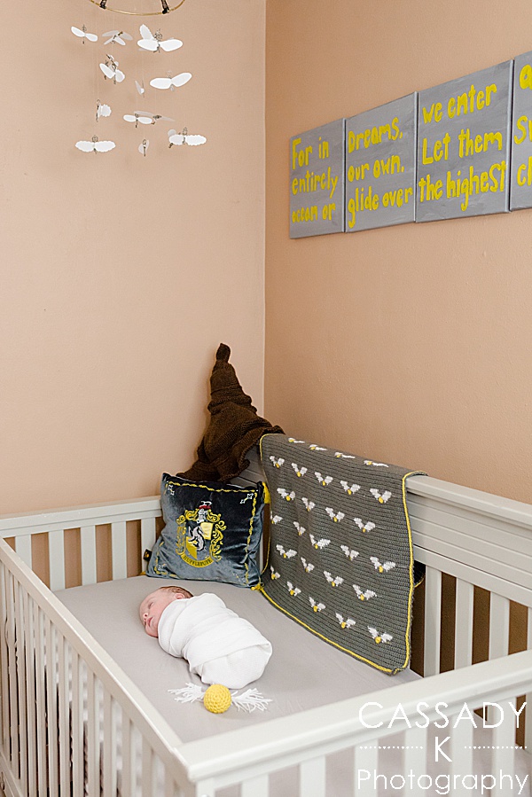 Megan likes Harry Potter and thanks to a friend who made the flying key mobile and Byron’s mother’s crocheting (the golden snitch, the sorting hat, and the golden snitch blanket) she was able to put together a Harry Potter nursery.