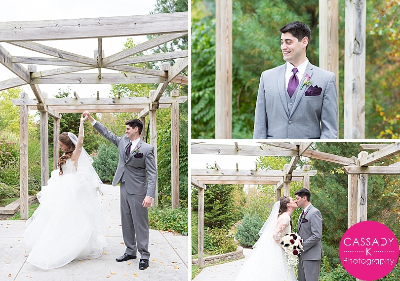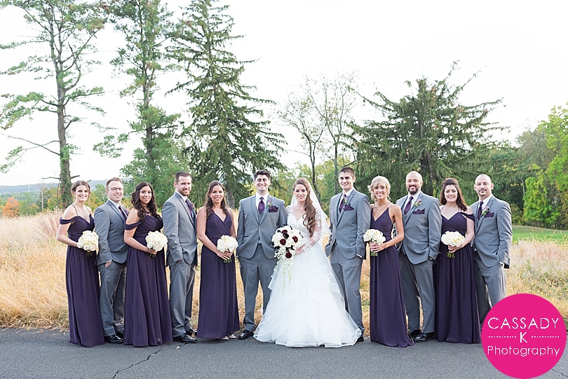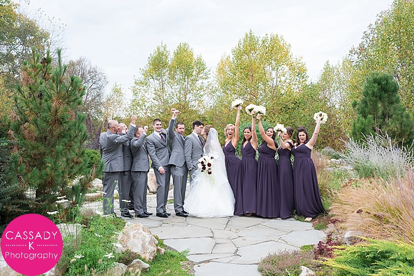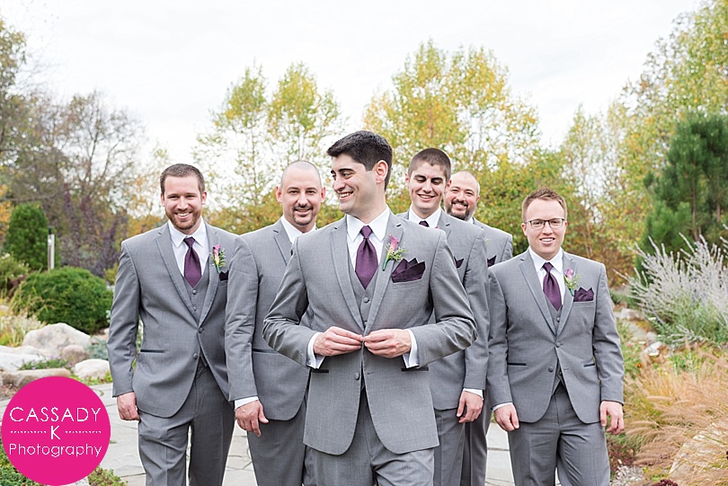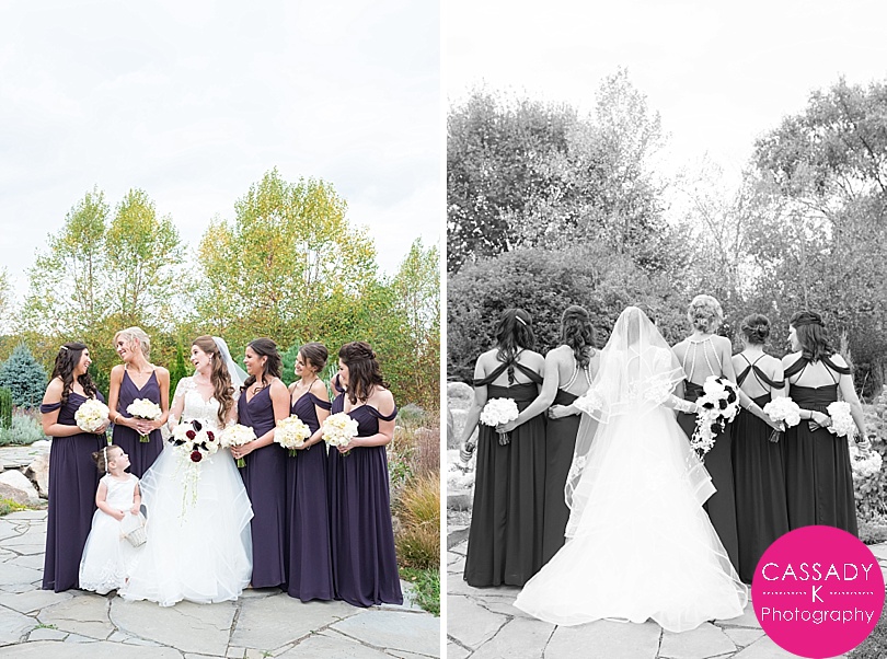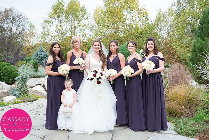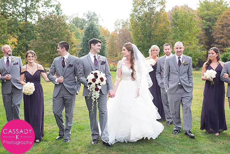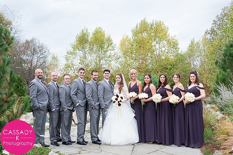 The plum on the bridesmaids and gray suits for the guys looked so beautiful in this garden.