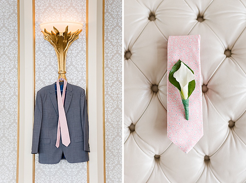 Groom's pink floral tie, watch, and other details for his Jewish Spring Glen Island Wedding in New Rochelle, NY in early May