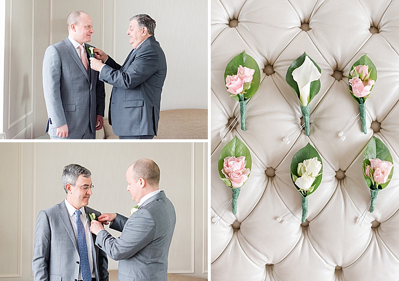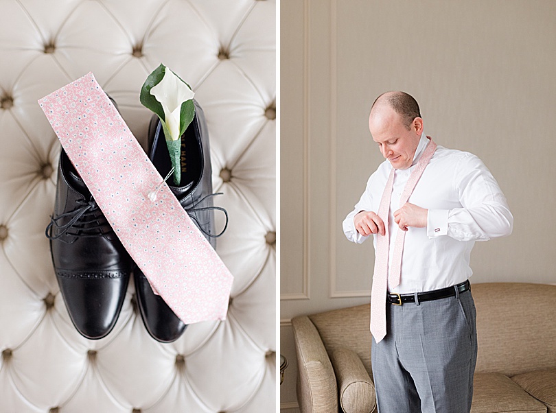 The groom getting ready at the Harbour Club and his floral pink tie for a Jewish Spring Glen Island Wedding in New Rochelle