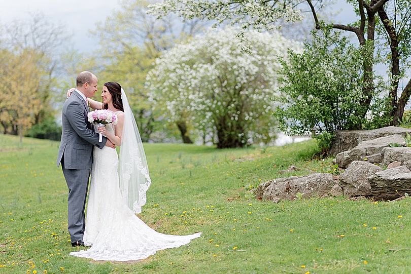 Bride and Groom portrait with flowering trees and green grass before their Jewish Spring Glen Island Wedding in New Rochelle