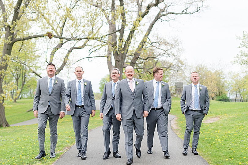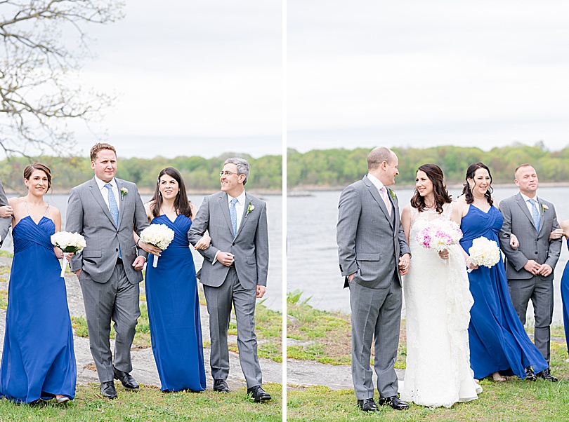 Bride and Groom walk along the water before their Jewish Spring Glen Island Wedding in New Rochelle, NY in early MayBridal party portrait along the water before a Jewish Spring Glen Island Wedding in New Rochelle, NY in early May
