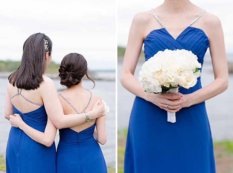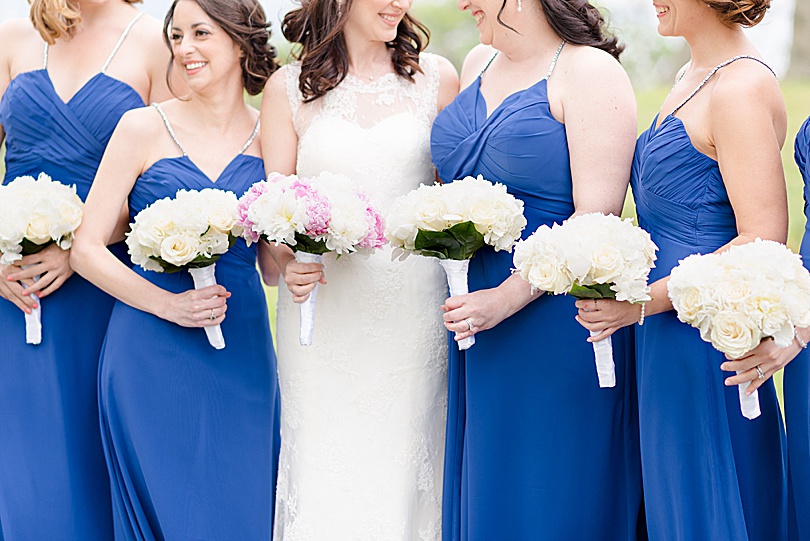 Bridesmaid dresses in cobalt and royal blue with white peony bouquets for a Jewish Spring Glen Island Wedding in New Rochelle