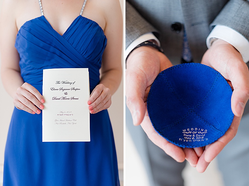 Personalized Kippahs in Royal Blue for a Spring Glen Island Wedding Jewish Ceremony in New Rochelle, NY in early May