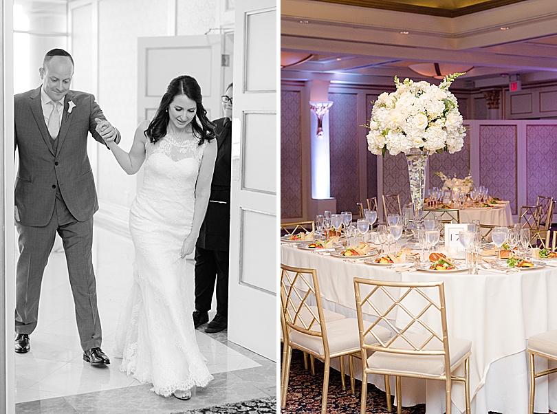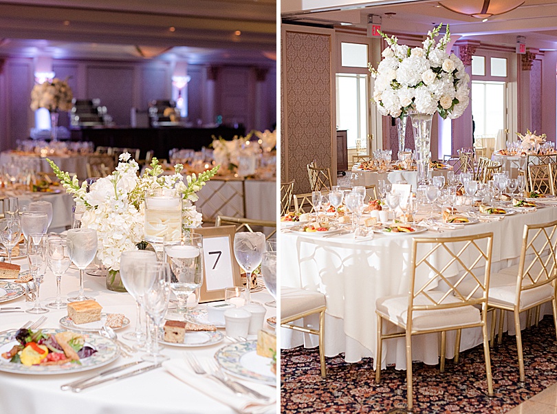 Reception space decorated with floral centerpieces for a Jewish Spring Glen Island Wedding in New Rochelle, NY in early May