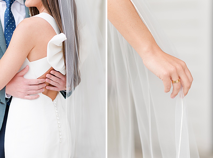 The Bride wore a single pearl on the top left of her bow in honor of her grandmother. And her gold ring was a ring that her and her sisters all had.