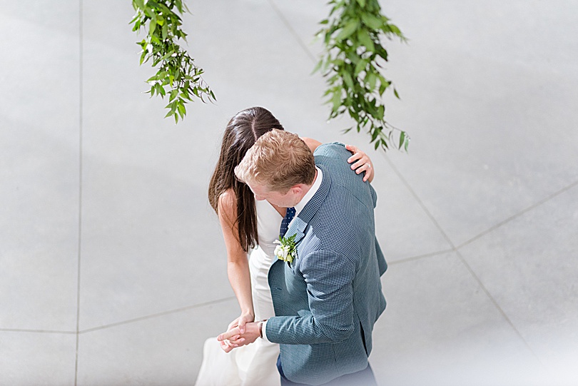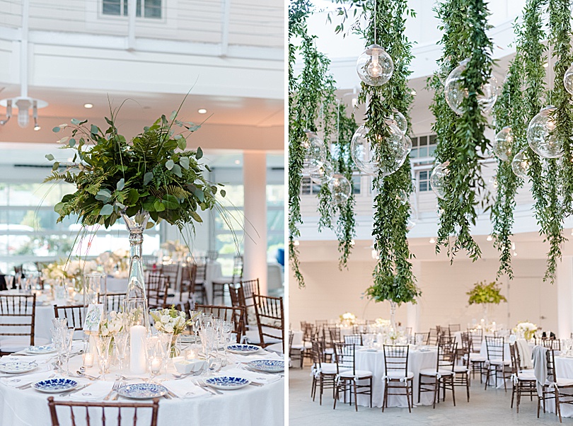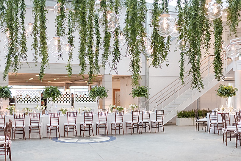 And now the hanging greenery! 🙂 The glass ball lights were already there, but thanks to the help of her wedding planner and her team, and the florist, they ran clear strings across the top balcony that ran around the reception space and then hung greenery from that string. As you walked through the reception space it was like a curtain of greenery and was low enough that the tips would just hit the tops of people who were tall.
