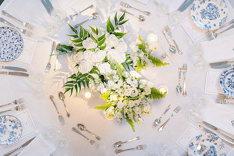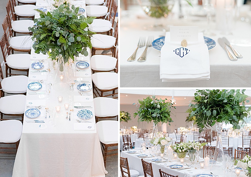 On top of all the greenery and florals lets’s talk about the blue tableware. It was incredible! The Bride actually rented the blue plates and glasses (which you’ll see further down) from a company in Texas! It is all antique so the plates and glasses were driven up by the company for the reception. The blue tableware added such an extra special touch to the style.