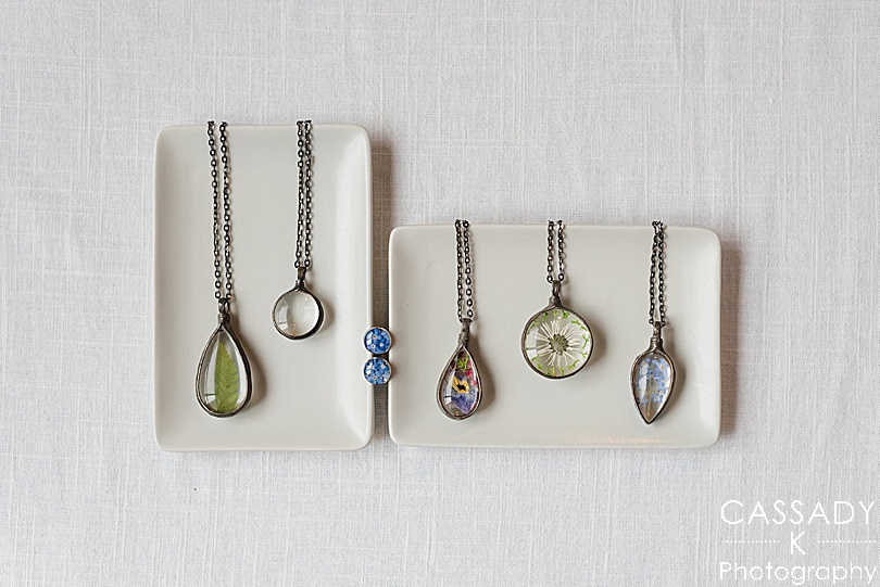 Sara gave each of her bridesmaids a necklace with flower pressed in glass and cuff links to her bridesman.