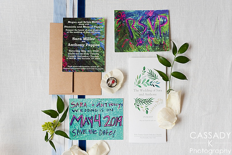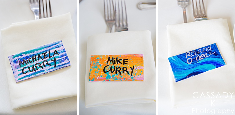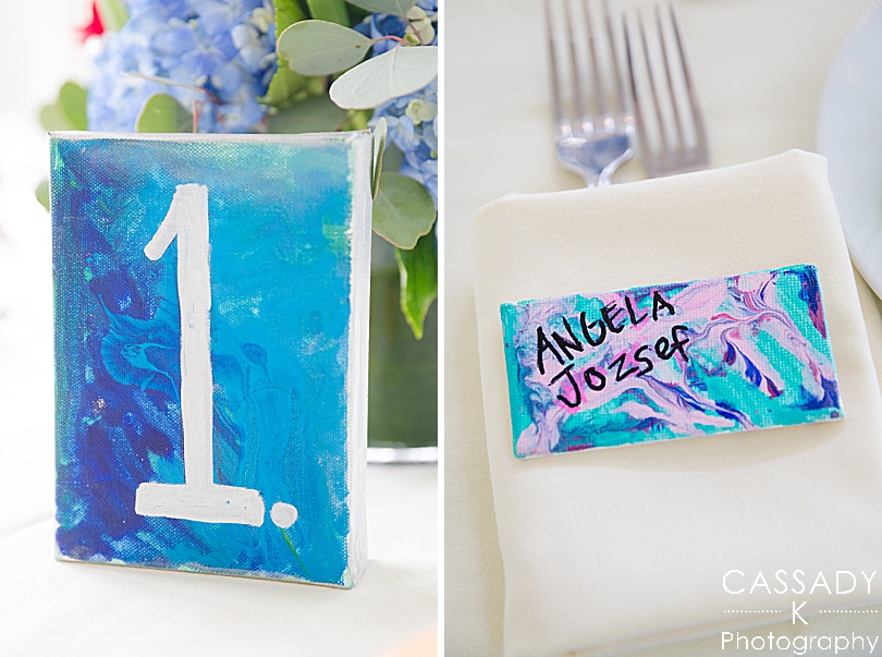 Sara also painted canvases with each table number on them. As soon as her and Anthony were engaged she even started painting little canvases for each guest. And not one single table number or guests’ canvas was the same.